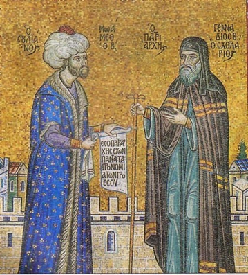 Das obige Bild ist ein zeitgenössisches Mosaik, welches sich am Eingang des Ökumenischen Patriarchats von Konstantinopel im istanbuler Stadtteil Fener befindet. Es zeigt auf der linken Seite Sultan Mehmed II, den Eroberer (1432-81), der nach der Eroberung Istanbuls 1453 eine Schriftrolle mit der Aufschrift Ἔσο Πατριάρχης ἔχων πάντα τὰ προνόμια τῶν πρὸ ἐσοῦ (Sei Patriarch und genieße alle Privilegien wie deine Vorgänger)“ an den orthodoxen Patriarchen Gennadious II. (1400-1473) überreicht. Dieses Mosaik wurde Ende der 1980er Jahre im Rahmen der Renovierungsarbeiten im Hauptgebäude des Patriarchats von einem griechischen Künstler im Auftrag der Kirche angefertigt. Damit beruft sich das Ökumenische Patriarchat in Istanbul auf eine lange Tradition der Allianz zwischen den osmanischen Herrschern und der orthodoxen Kirche. Es weist auf den Schutz hin, den das Patriarchat von Konstantinopel seitens der Osmanen, trotz der vielen Probleme, Krisen und Konflikte, dauerhaft über Jahrhunderte genossen hat. Gennadious II war der erste orthodoxe Patriarch, der nach der Eroberung Konstantinopels durch Sultan Mehmed II eingesetzt wurde. Der letzte Patriarch hatte im Dezember 1452 (also sechs Monate vor dem Fall Konstantinopels) aus Protest gegen die Abhaltung des Gottesdienstes nach katholischem Ritus in der Hagia Sophia-Kirche abgedankt. Seit dem hatte die orthodoxe Kirche keinen Patriarchen. Sultan Mehmed setzte jedoch auf Kontinuität: Im Januar 1454, einige Monate nach der Einnahme der Stadt, setzte er Gennadios als neuen Patriarchen ein, erteilte ihm bestimmte Privilegien, versprach den Christen im Land und in der Stadt Religionsfreiheit zu und lud damit die Christen, die die Stadt während und nach dem Krieg verlassen haben wieder nach Istanbul ein. Direkt nach dem Krieg und der Umwandlung der Hagia Sophia Kirche in eine Moschee suchte der Sultan den Ausgleich mit seinen christlichen Bürgern und machte deutlich, dass er nicht nur der Herrscher der Muslime sei, sondern des gesamten Volkes.